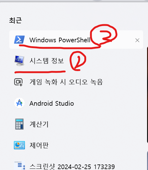 1. 시스템 정보를 확인 했다면, 2. Windows PowerShell을 검색하여 우클릭을 하면 "관리자 권한으로 실행"을 진행한다.